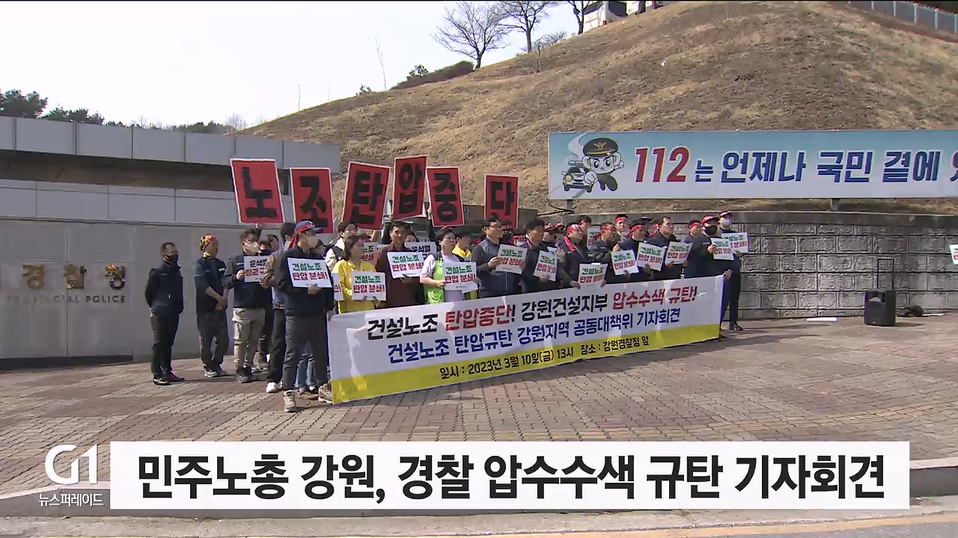 전국민주노동조합총연맹 강원지역본부가 오늘(10일) 강원경찰청 앞에서 최근 강원건설노조에 대한 경찰의 압수수색을 규탄하는 기자회견을 열었습니다.