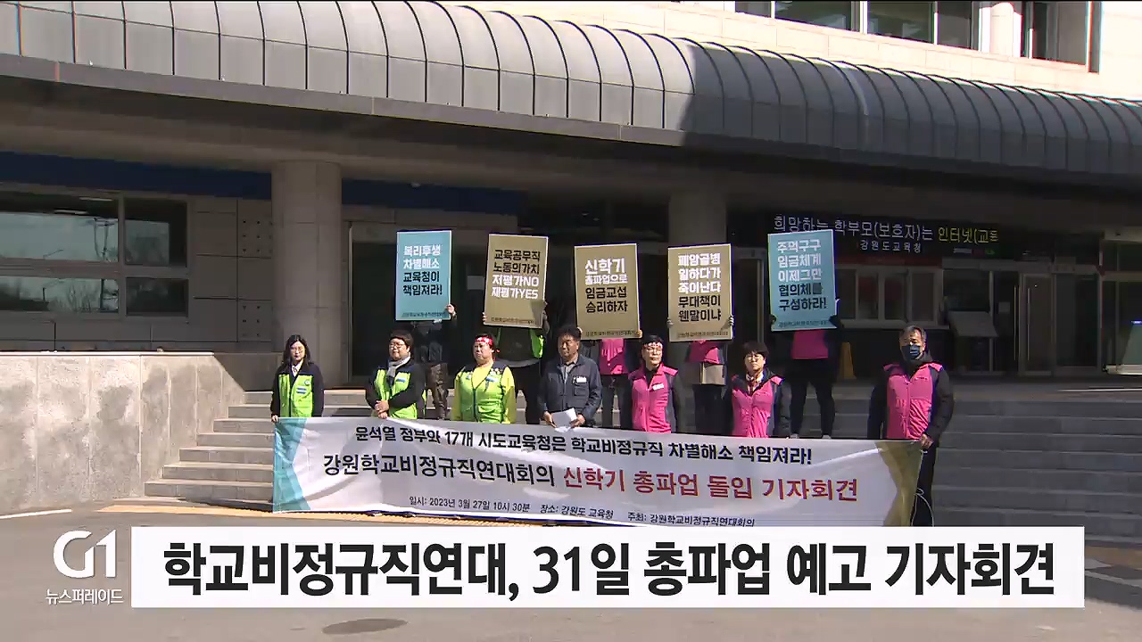 강원학교비정규직연대회의가 오늘(27일) 도 교육청 앞에서 총파업 돌입을 예고하는 기자회견을 가졌습니다.