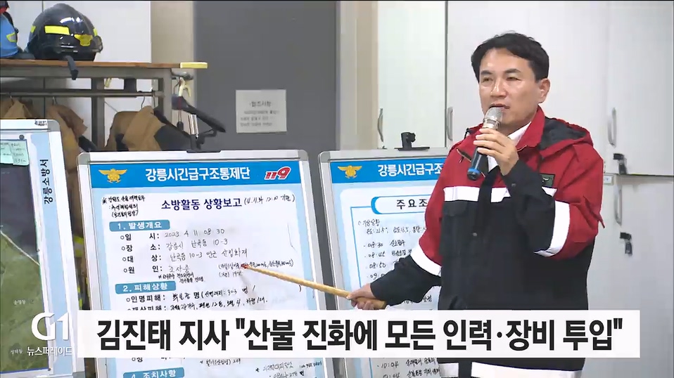 김 지사는 오늘(11일) 오후 강릉 경포119안전센터에 마련된 현장지휘소에서 기자회견을 열고 산불이 강릉 도심으로 번지지 않도록 방화선을 구축했으며 산불 진화를 위해 인력 1800여 명을 투입 중이라고 설명했습니다.