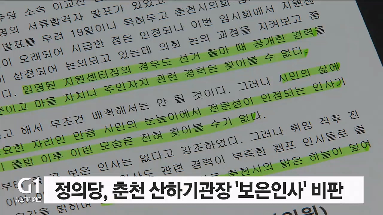 정의당 춘천시위원회는 성명을 내고, "최근 임명된 춘천시 산하기관장 중 일부가 민선8기 춘천시 인수위원회에서 활동한 인사"라며 관련 전문 경력을 찾아볼 수도 없다고 지적했습니다.