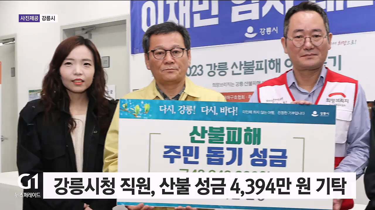 성금은 지난 17일부터 20일까지 나흘간 김홍규 강릉시장과 김종욱 부시장 등 77개 부서 직원들이 동참해 마련했습니다.