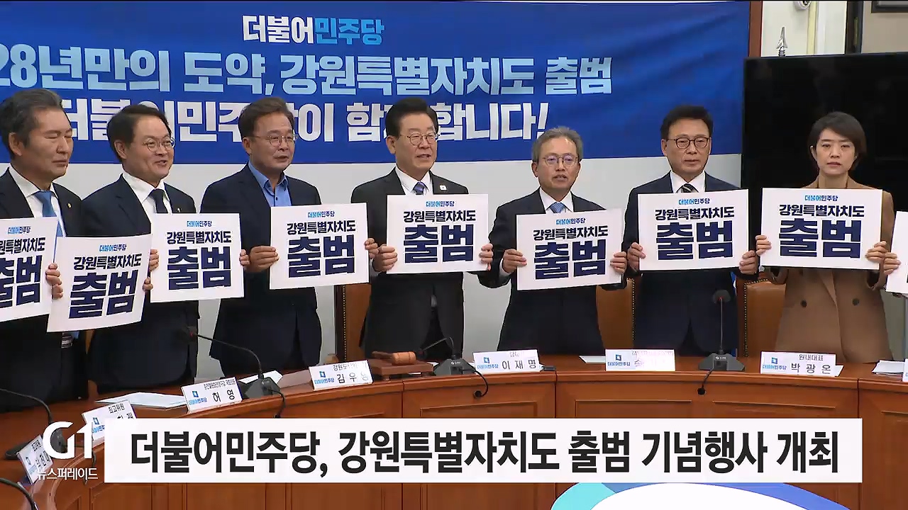 더불어민주당은 오늘(26일) 국회 본청 당대표 회의실에서 이재명 대표와 송기헌 원내 수석부대표 등이 참석한 가운데, 강원특별자치도 출범 기념행사를 가졌습니다.