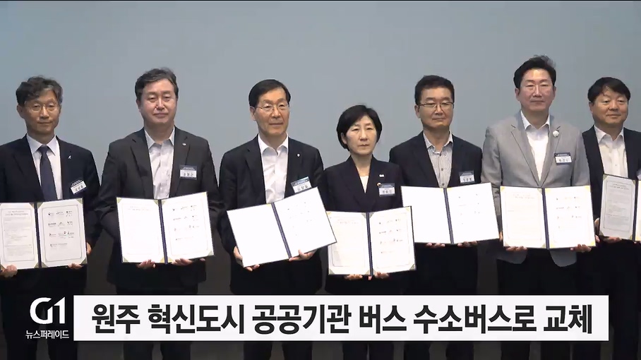 환경부와 강원도, 원주시와 혁신도시 내 공공기관은 오늘(8일) 원주 인터불고 호텔에서 수소버스 전환을 위한 업무 협약을 맺었습니다.