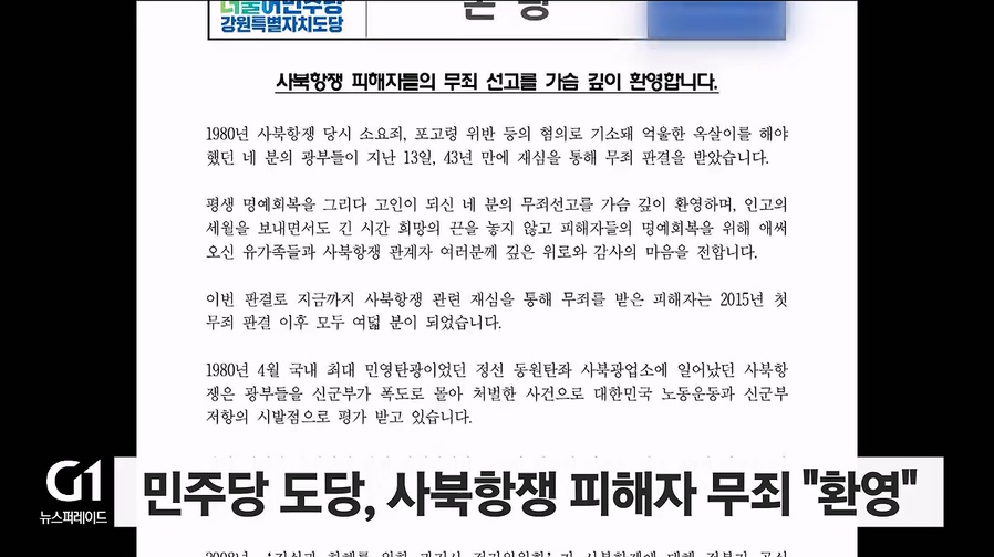 더불어민주당 강원특별자치도당이 소요죄와 포고령 위반 등의 혐의로 기소돼 억울한 옥살이를 했던 사북항쟁 관련 광부들의 무죄 판결에 대해 환영의 뜻을 밝혔습니다.