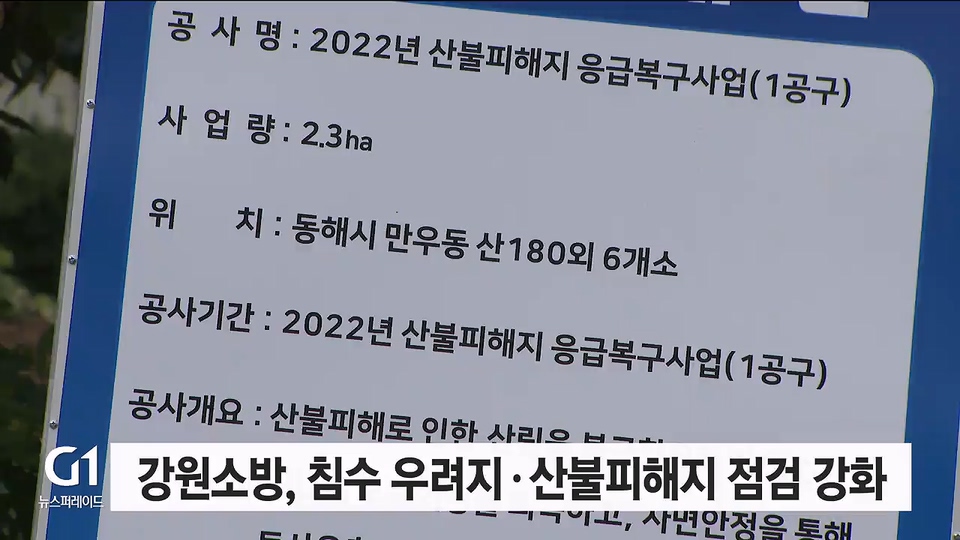 강원소방은 침수 취약 지역 213곳을 대상으로 현장 점검을 하고, 강릉산불 피해지 토사유출 우려 지역을 중심으로 예찰 활동을 강화합니다.