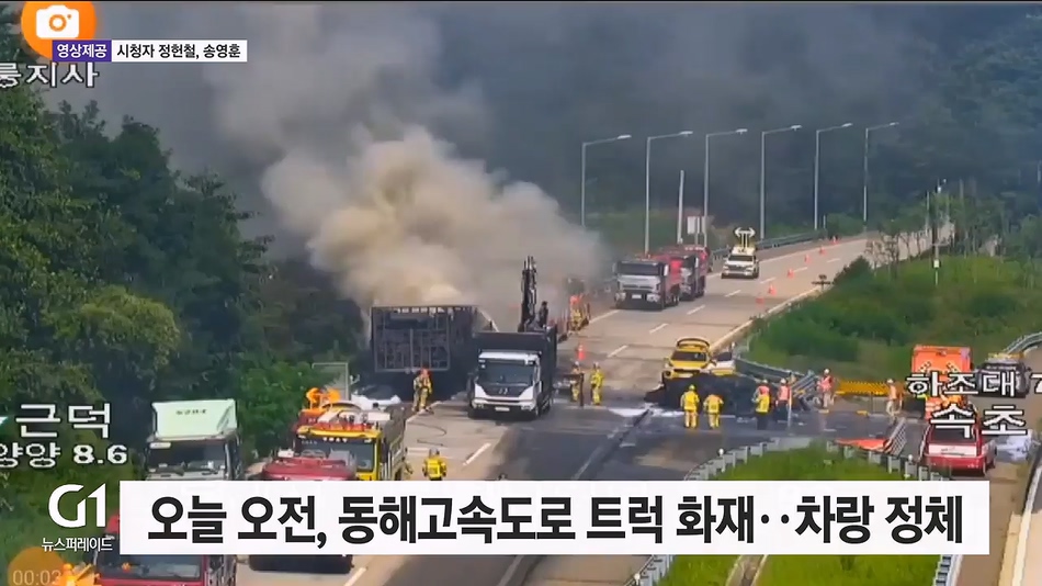 오늘(23일) 오전 8시 18분쯤 양양군 현남면 동해고속도로 강릉 방면에서 폐타이어를 실은 트레일러 차량에서 불이 나, 40여분 만에 꺼졌습니다.