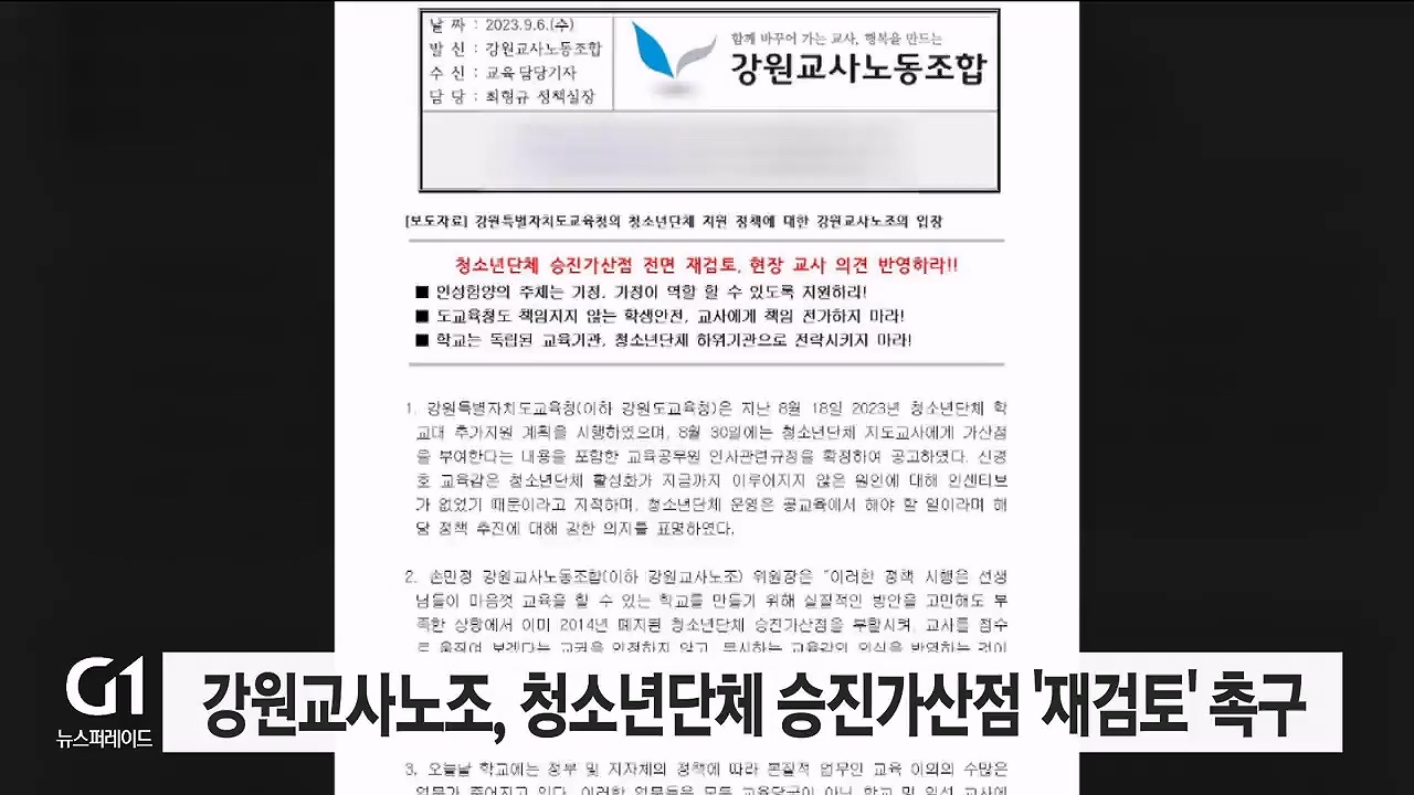 강원특별자치도 교육청이 청소년 단체 지도교사에게 승진 가산점을 부여하기로 한 것과 관련해, 강원교사노동조합이 전면 재검토를 촉구했습니다.