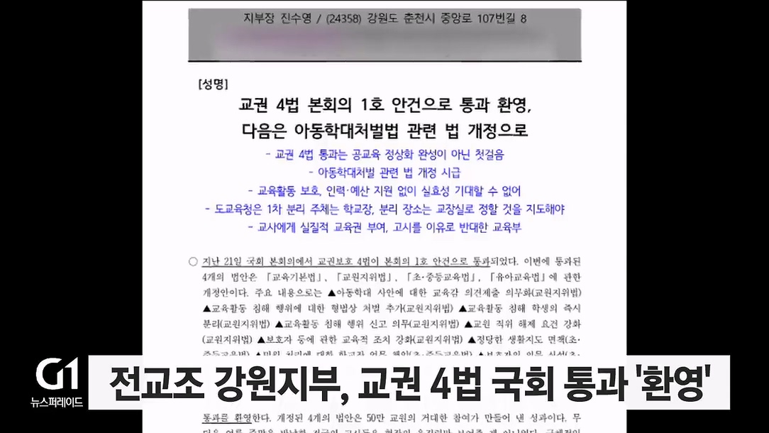 초중등교육법과 교육기본법 등 '교권보호 4법'이 어제(21일) 국회 본회의에서 1호 안건으로 통과된 것과 관련해, 전교조 강원지부가 환영의 뜻을 밝혔습니다.