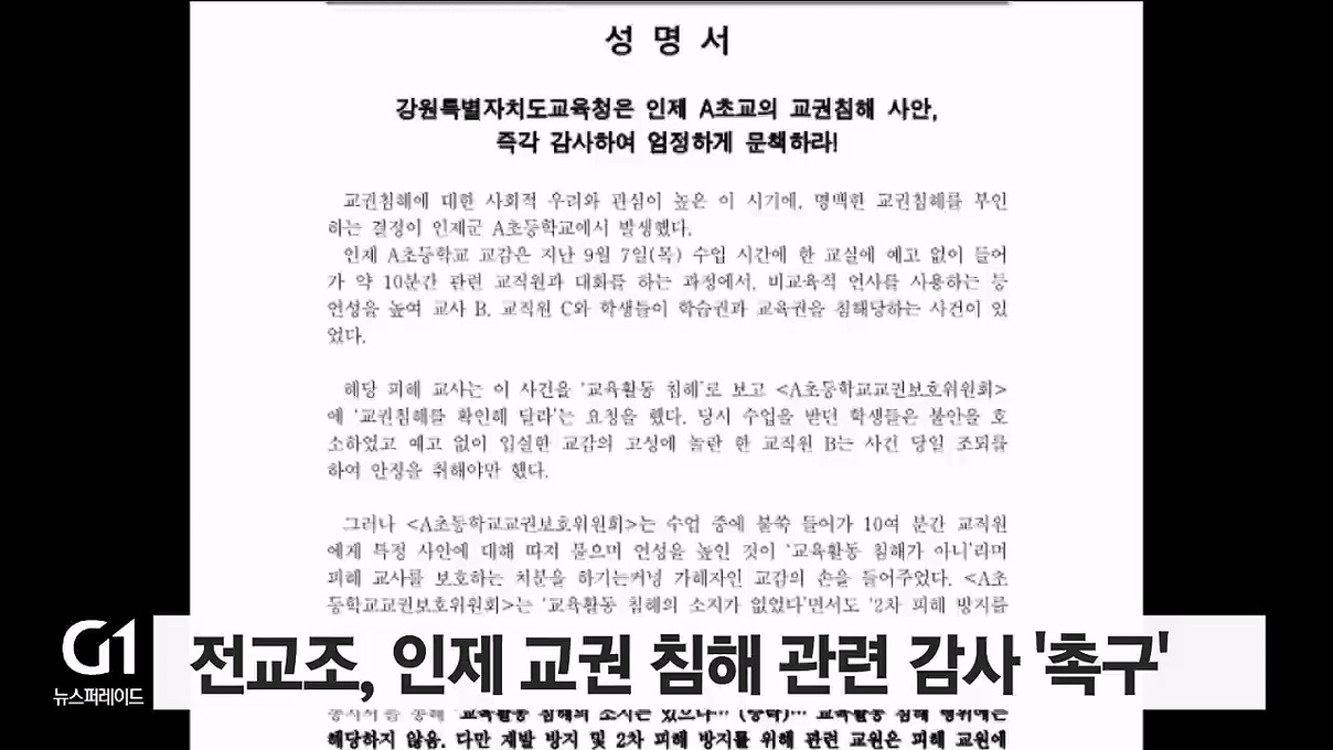 전교조 인제지회는 성명서를 발표하고 인제의 한 초등학교에서 발생한 교권 침해 신고와 관련해, 도교육청의 감사를 촉구했습니다.