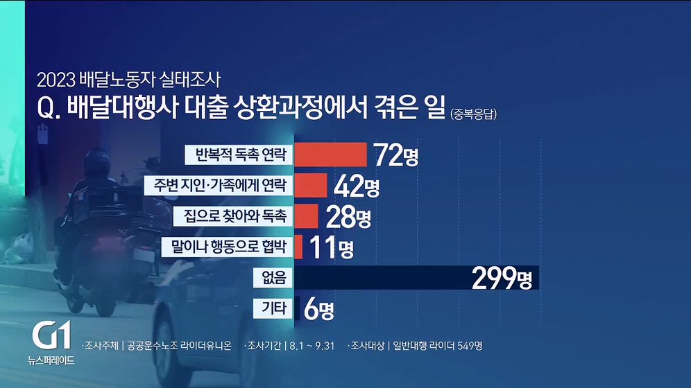 이중 반복적으로 독촉을 받은 배달노동자가 16.4%로 가장 많았고,