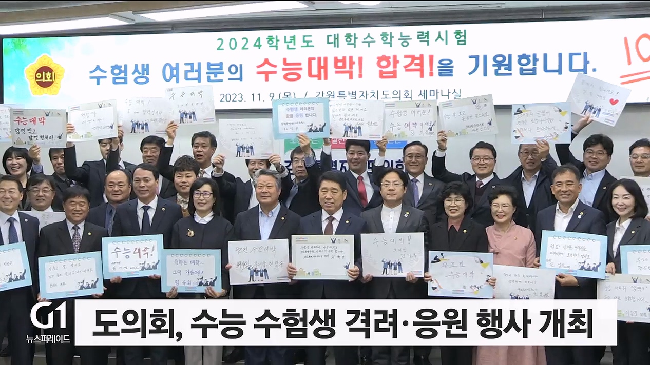 권혁열 의장을 비롯한 강원특별자치도의원 48명이 대학수학능력시험을 앞둔 수험생들을 응원하는 행사를 열었습니다.