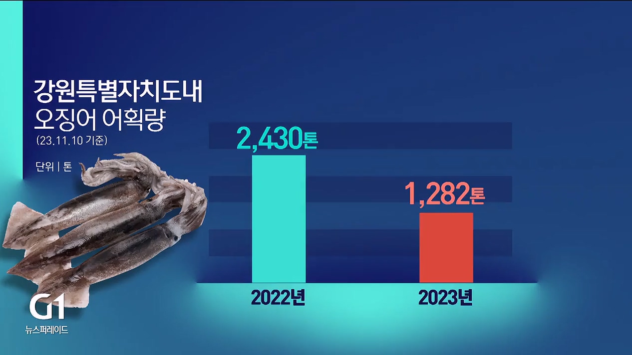 /올해 도내 오징어 어획량은 모두 1,282톤으로 지난해에 비해 절반 수준으로 급감했습니다.