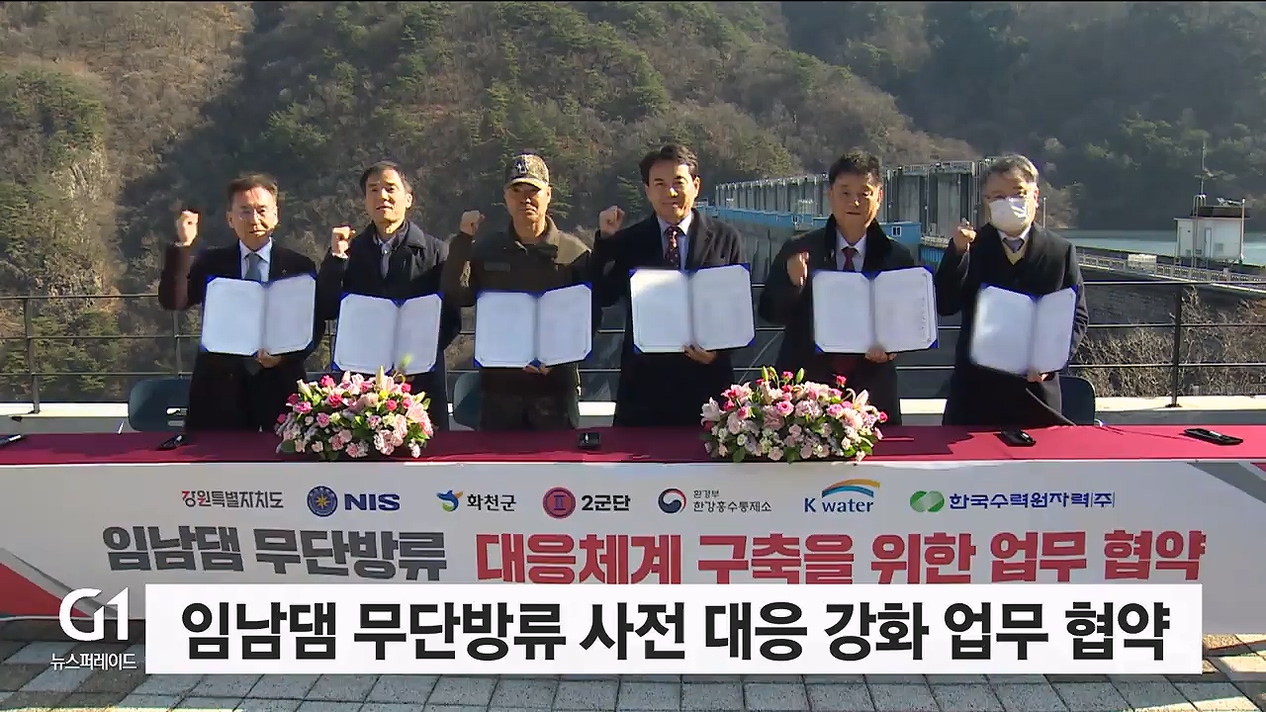 화천댐에서 열린 협약에는 도와 국가정보원, 화천군, 2군단, 한국수자원공사, 한국수력원자력 등 기존 6개 기관에 한강홍수통제소를 더해 7개 기관이 참여했습니다.