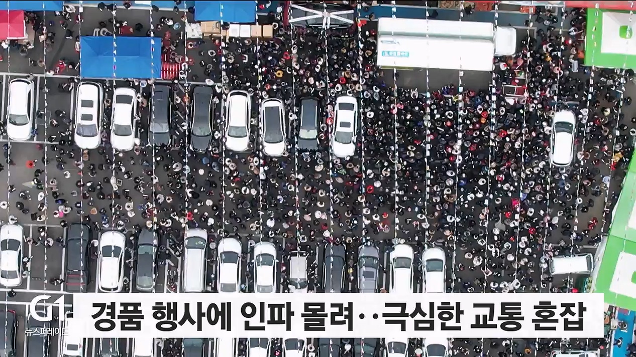각각의 건물 2동을 건축하고, 통로를 연결해 영업하고 있는 원주의 한 마트에서 경품행사를 벌이면서 빚어진 풍경입니다.