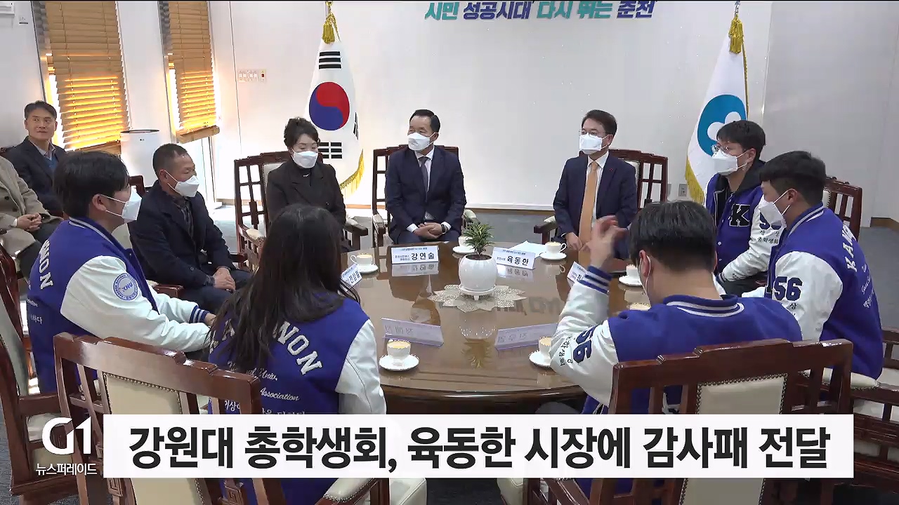 강원대학교 총학생회가 시내버스 개편에 따른 학내 노선 신설과 관련해 춘천시청을 찾아 육동한 시장에게 감사패를 전달했습니다.
