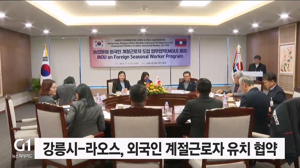 강릉시는 라오스 노동사회복지부와 외국인 계절근로자 유치 협력 협약을 체결하고, 올해 18개 농가에 59명의 인력 배치를 합의했습니다.