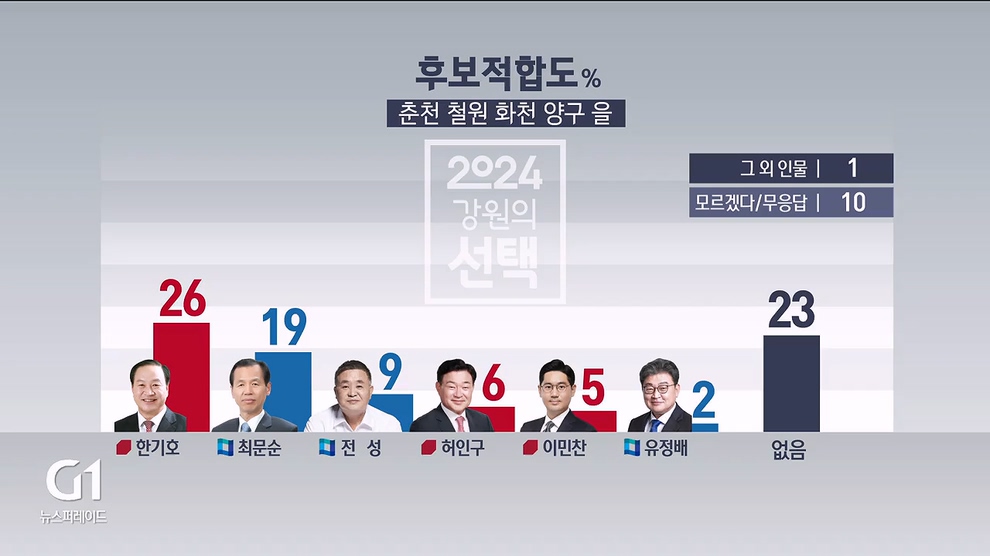 최문순 전 강원도지사 19%, 전성 변호사 9%, 허인구 전 G1방송 대표이사 6%, 이민찬 국민의힘 상근부대변인 5%, 유정배 전 대한석탄공사 사장이 2%를 기록했습니다.