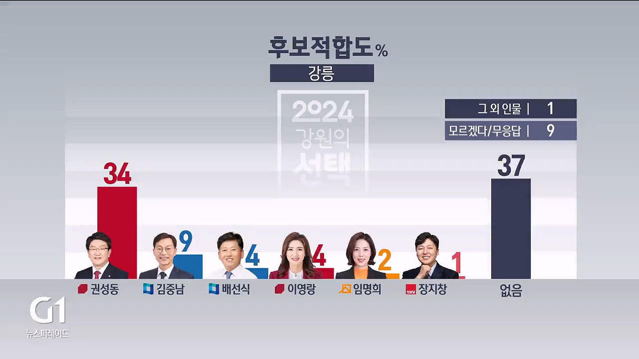/권성동 국민의 힘 국회의원이 34%로 선두, 김중남 더불어민주당 도당 탄소중립특별위원장이 9%로 뒤를 이었습니다.