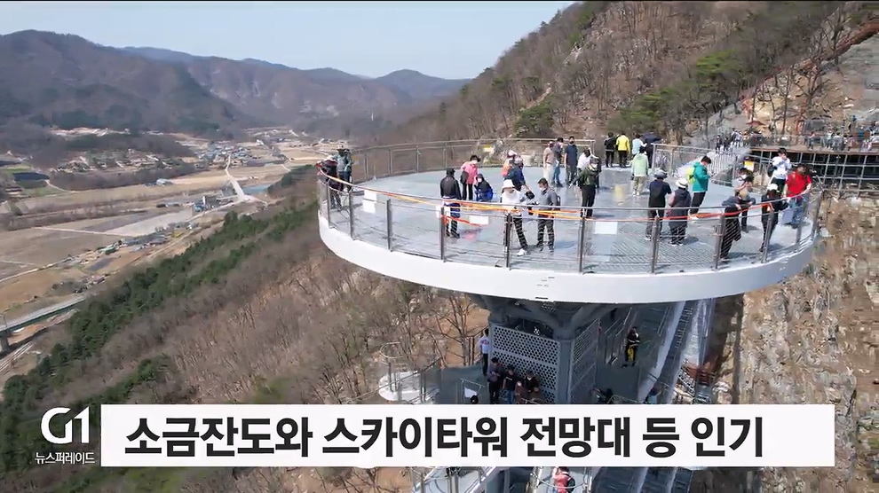 절벽을 따라 놓인 소금잔도와 높이 백 50m의 스카이타워 전망대.