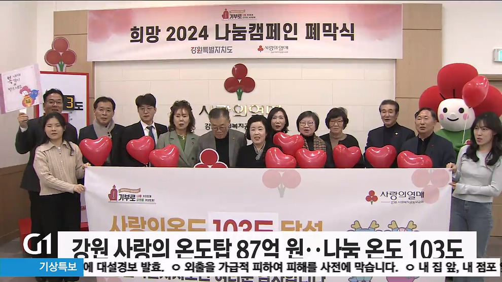 강원 사랑의 온도탑이 87억 7천 5백만 원이 모금돼 나눔 온도 103도로 종료됐습니다.