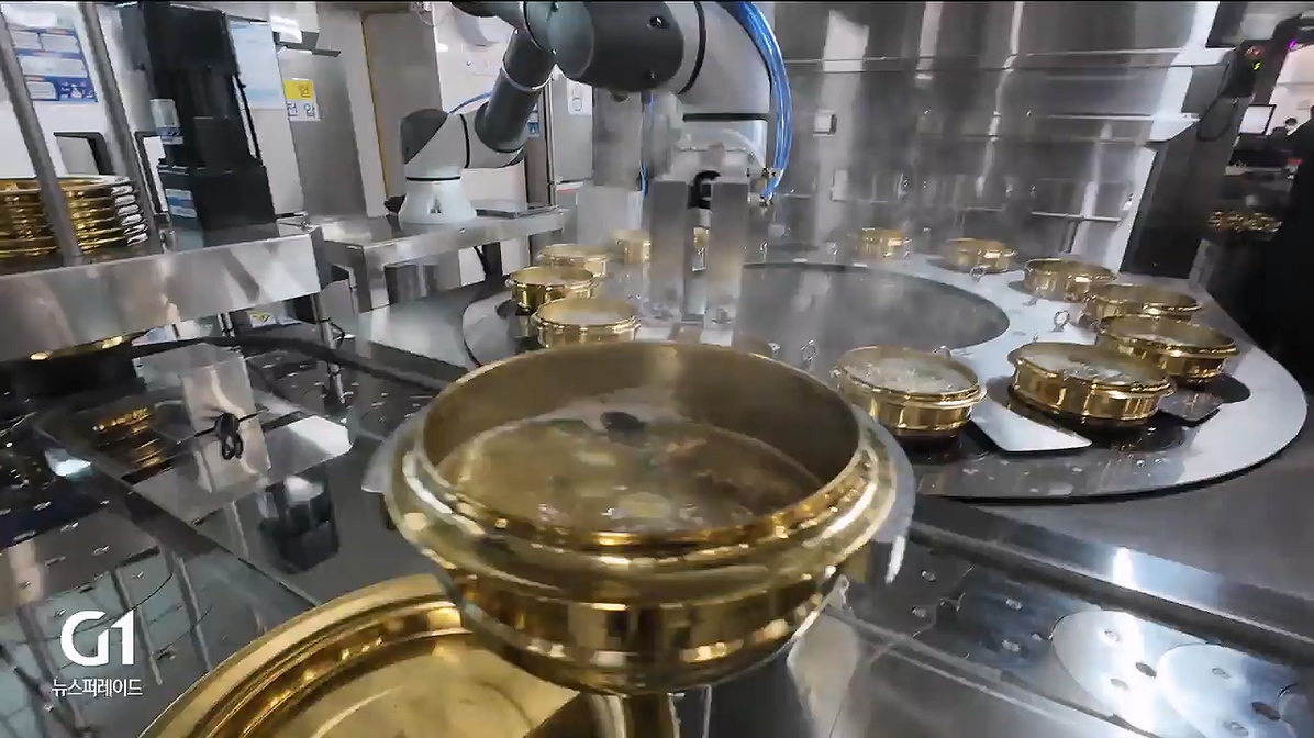 레일을 따라 뜨거운 용기를 척척 옮기더니 금세 따뜻한 갈비탕이 완성됩니다.