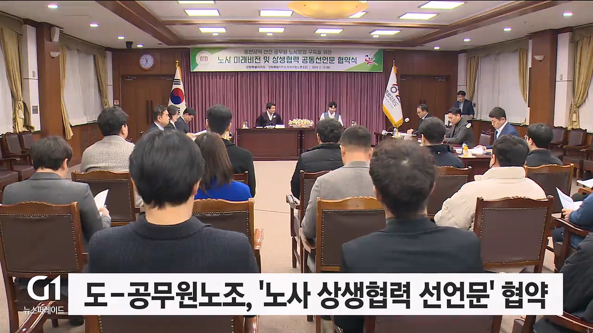 강원특별자치도와 도청공무원노동조합은 오늘(13일) '노사간 미래 비전 공유와 상생협력을 위한 공동 선언문' 협약식을 가졌습니다.
