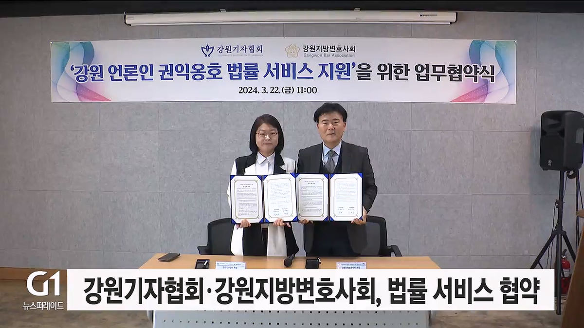 강원기자협회와 강원지방변호사회는 오늘(22일) 춘천 문화재단 아르숲 생활문화센터에서 '강원언론인 권익옹호 법률 서비스 지원'에 대한 업무 협약을 맺었습니다.