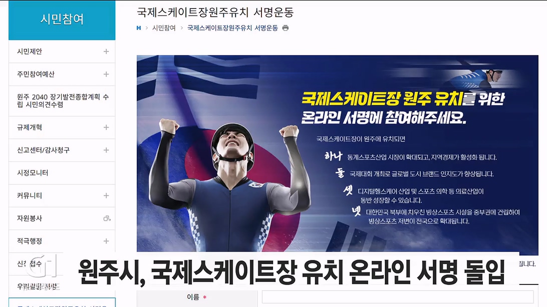 원주시, 국제스케이트장 유치 온라인 서명 돌입