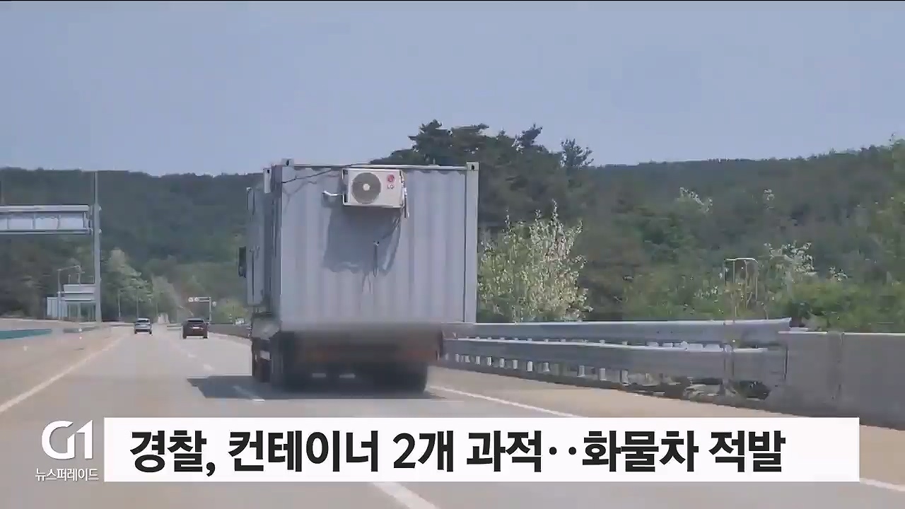 최근 컨테이너 2개를 적재함에 무리하게 싣고 고속도로를 달린 25톤 화물차가 경찰에 적발됐습니다.