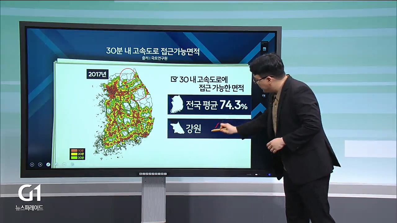 2019년 기준, 30분 안으로 고속도로에 접근 가능한 면적은 전국 74.3%