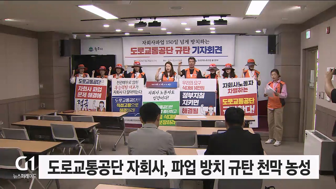 도로교통공단 자회사인 도로교통안전관리는 오늘 원주시청에서 기자회견을 열고 다섯달 넘게 파업을 방치하고 있는 도로교통공단을 규탄했습니다.