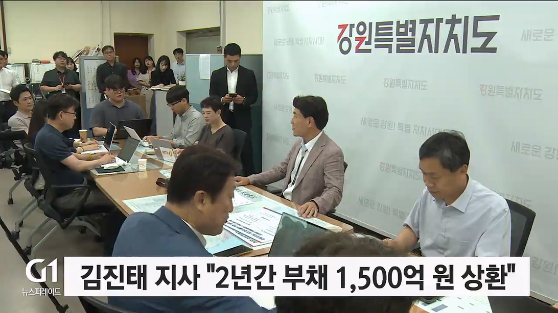 김진태 도지사는 오늘(24일) 취임 후 2년 강원 도정을 설명하는 자리에서 "임기 초반 3천500억 원의 빚을 갚았지만 작년 연말 세수 부족으로 인해 부득이 하게 2천억 원을 내부 기금에서 활용하면서 지금까지 갚은 빚은 천500억 원"이라고 말했습니다.