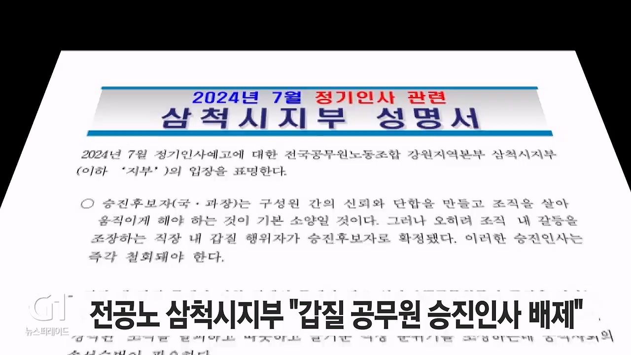전국공무원노동조합 삼척시지부가 성명을 내고 7월 정기인사 예고에 대한 철회를 요구했습니다.