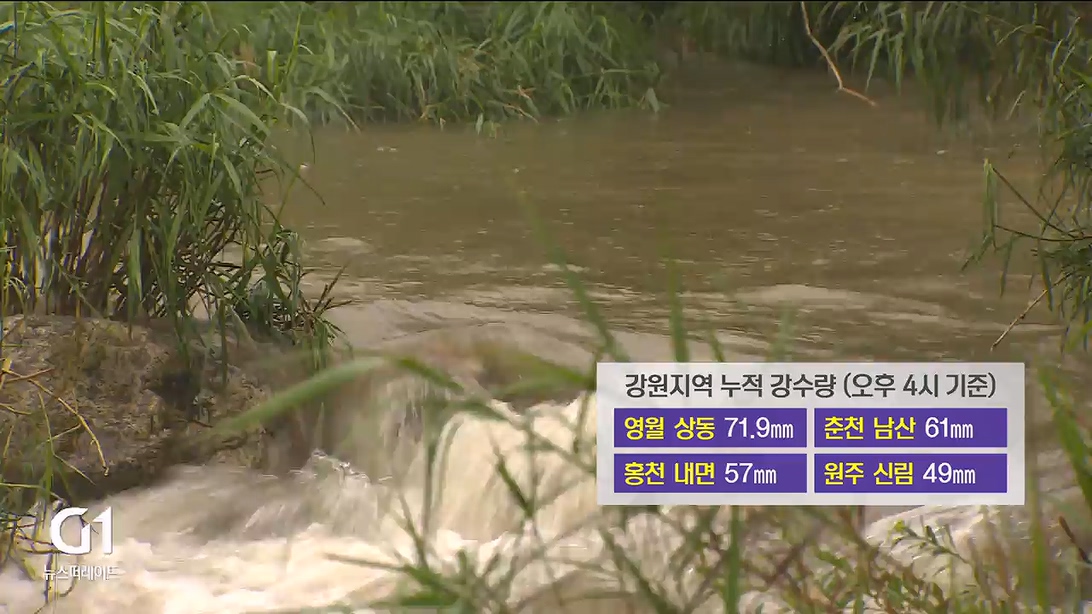 현재까지 내린 비의 양은 오후 4시 현재 영월 상동 71.9, 춘천 남산 61, 홍천 내면 57, 원주 신림 49mm입니다.