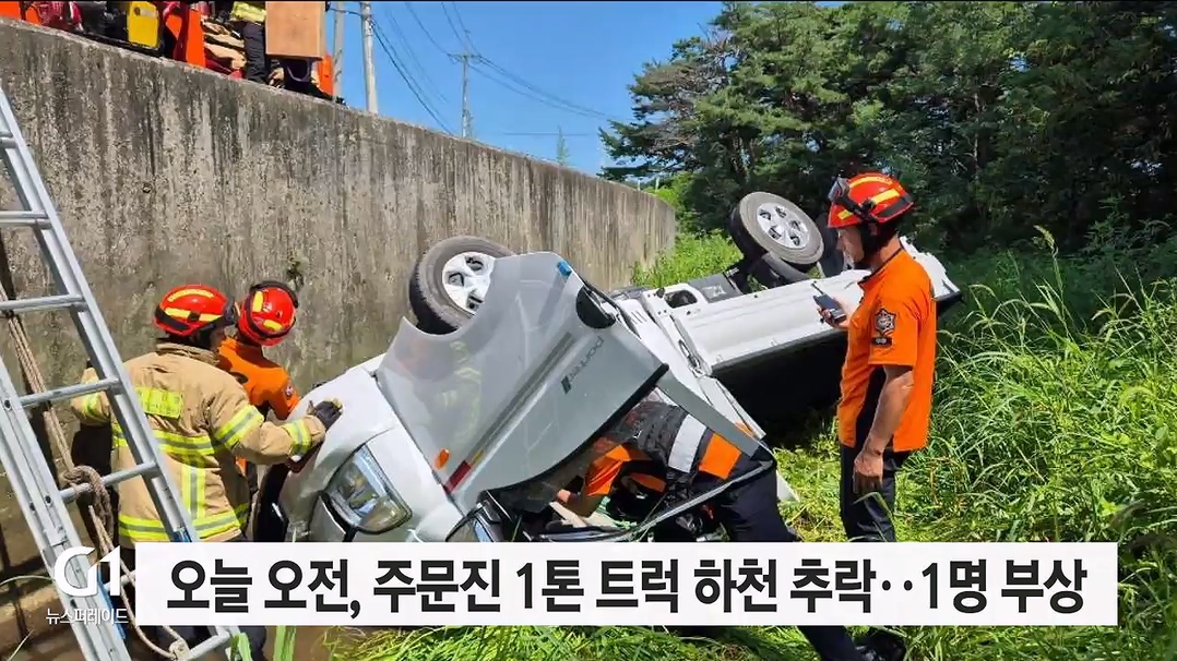 오늘 오전 11시 19분쯤, 강릉시 주문진읍 장덕리 인근 도로에서 1톤 트럭이 도로 옆 3m 아래 하천으로 추락했습니다.