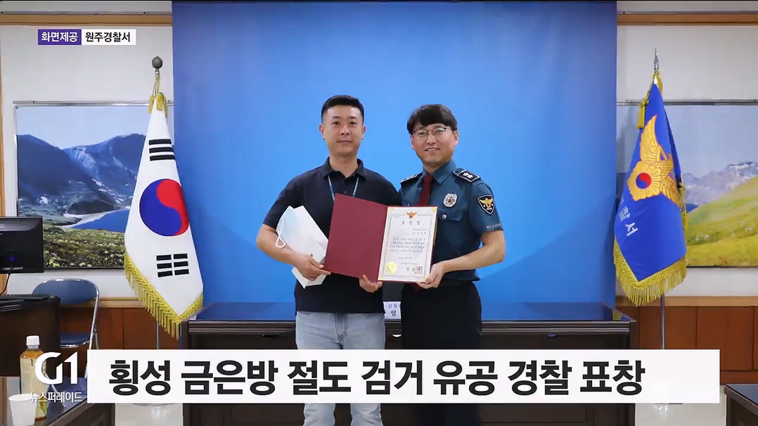 원주경찰서 강력3팀 최승혁 경사와 횡성경찰서 형사팀 정재운 경장은 지난 17일 새벽 횡성의 한 금은방에서 2억 원 상당의 귀금속 훔쳐 달아난 피의자를 2시간 30분 만에 체포했습니다.