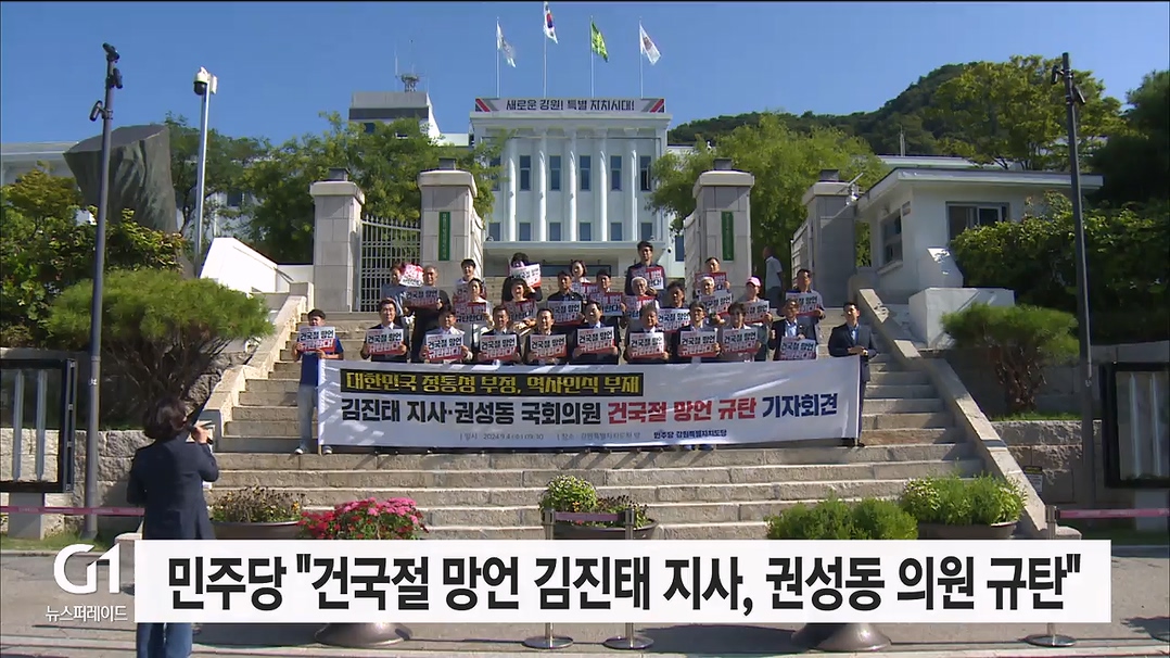 민주당 도당은 "김진태 지사와 권성동 의원은 대한민국의 정통성을 부정하고 역사인식의 부재를 보여줬다"며,