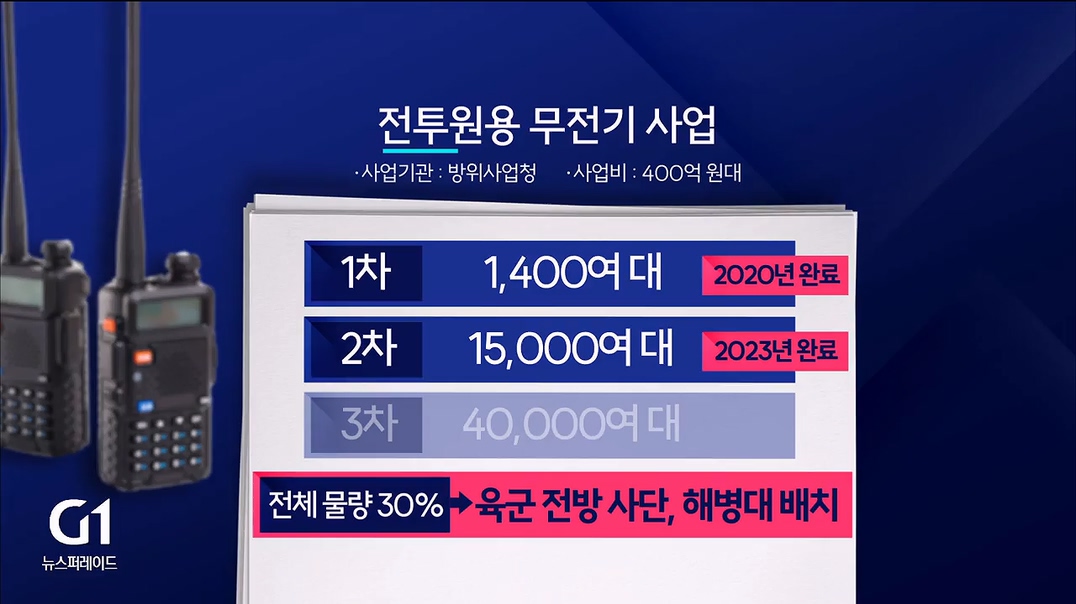 G1방송은 지난 2024년 9월 24일부터 10월 31일까지 61회에 걸쳐 TV 방송 및 홈페이지, 유튜브를 통해 우리 군이 납품받은 전투원용 무전기가 통신거리가 짧고, 방수가 안되며 전원을 끄지 않은 채로 배터리를 빼면 채널 정보가 삭제되는 등 성능이 떨어지고, 1, 2차 무전기 간 호환도 되지 않으며, 불량률도 높아 결국 무전기 개선에 20억을 추가로 투입 예정이고, 입찰 과정에서 납품업체에만 특정 정보를 줬다는 특혜 의혹도 불거졌다고 보도했습니다.