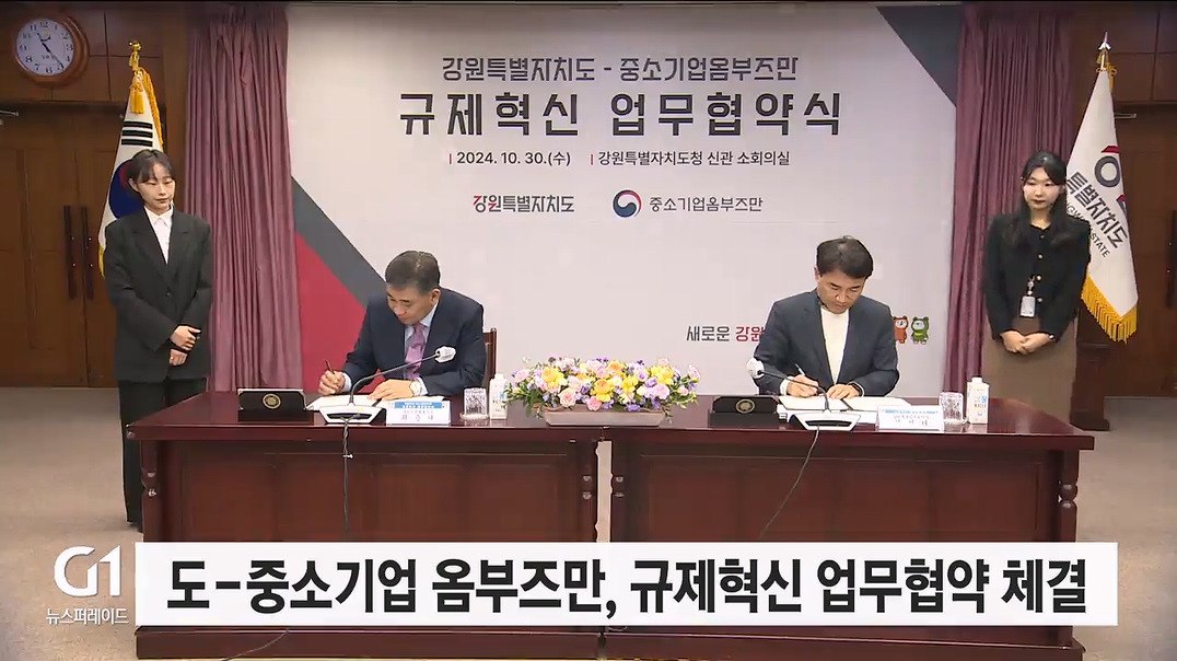 강원자치도와 중소기업 옴부즈만은 오늘(30일) 도청 신관 소회의실에서 중소기업 규제혁신을 위한 상호 업무협약을 체결했습니다.