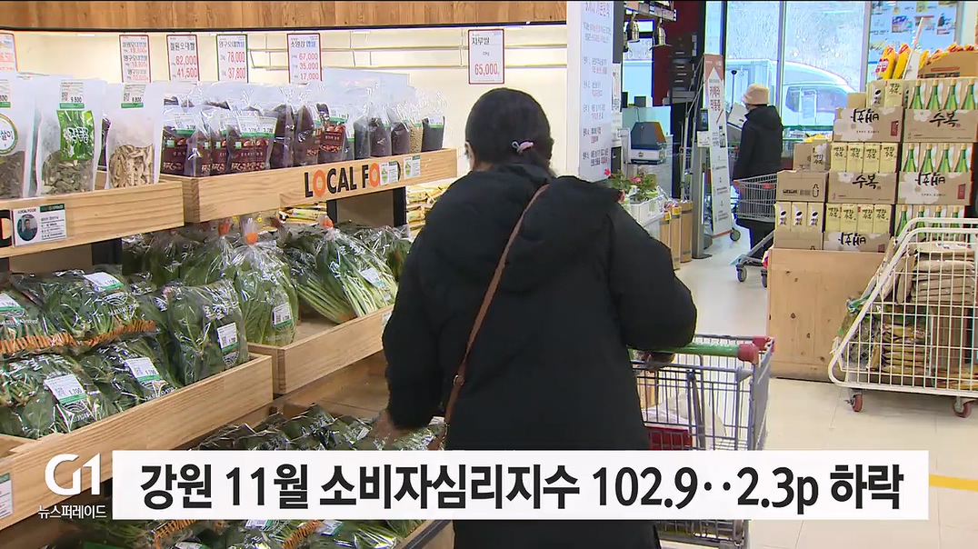 한국은행 강원본부의 '11월 강원지역 소비자동향조사 결과'를 보면, 이번달 강원 소비자심리지수는 102.9로 지난달보다 2.3p 하락했습니다.