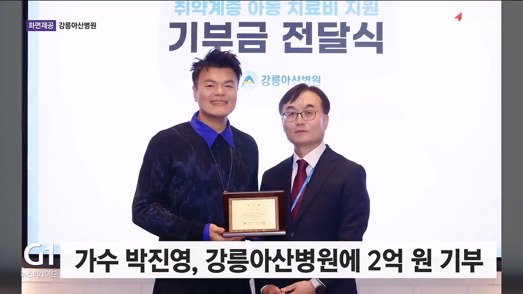 강릉아산병원은 어제(10일) 박진영 씨가 질환을 앓고 있지만 경제적 사정으로 치료에 어려움을 겪고 있는 어린이들에게 희망을 주고 싶다며 사재 기부금 2억 원을 전달했다고 밝혔습니다.