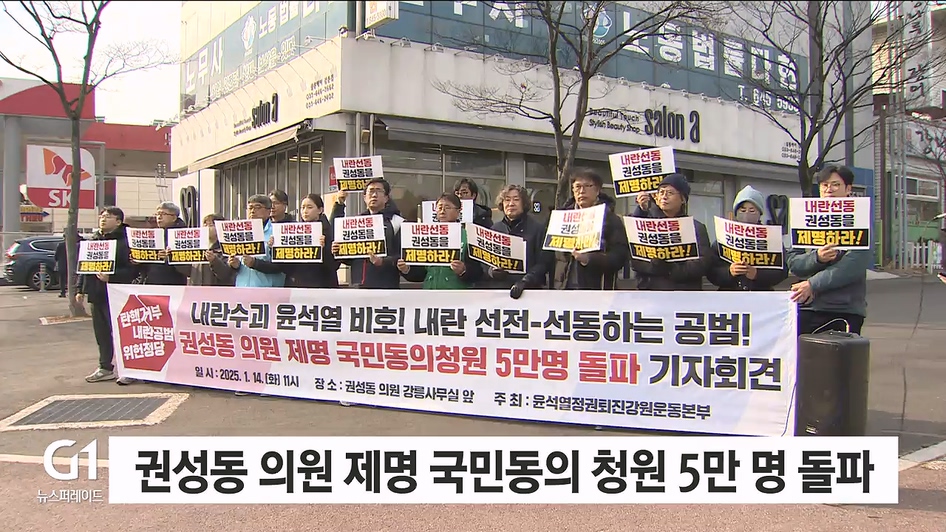 윤석열정권 퇴진강원운동본부는 국민의힘 권성동 국회의원 강릉 사무실 앞에서 기자회견을 열고 권 의원의 의원직 제명을 촉구했습니다.