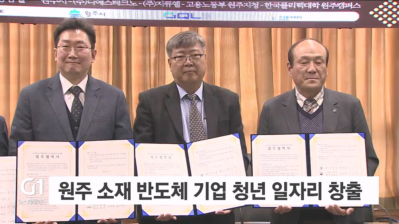 원주시는 오늘(4일) 시청 투자상담실에서 반도체 기업과 한국폴리텍대학 원주캠퍼스, 고용노동부 원주지청과 반도체 기업 맞춤형 일자리 창출을 위한 업무 협약을 맺었습니다.
