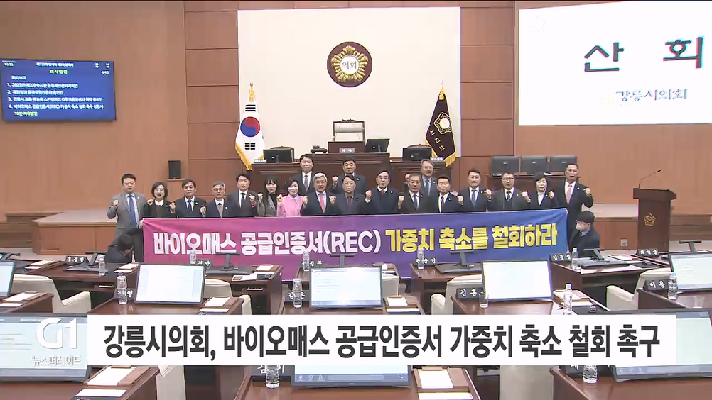 강릉시의회는 '제320회 임시회 2차 본회의'에서 성명서를 발표하고, '정부의 바이오매스 발전소 공급인증서 가중치 축소 방침은 지역 경제를 심각하게 위협할 것'이라고 지적했습니다.