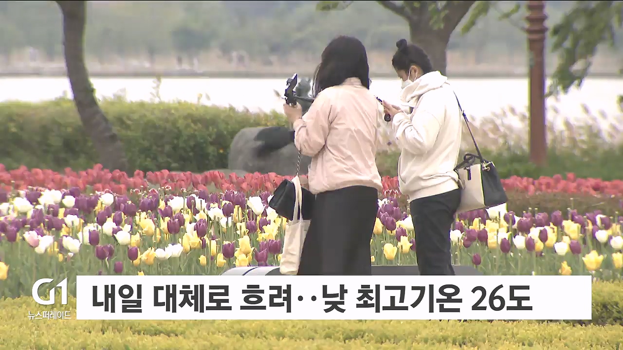 아침 최저기온은 영상 11도에서 15도, 낮 최고기온은 영서권 영상 21도에서 24도, 영동권 영상 21도에서 26도의 분포를 보이겠습니다.