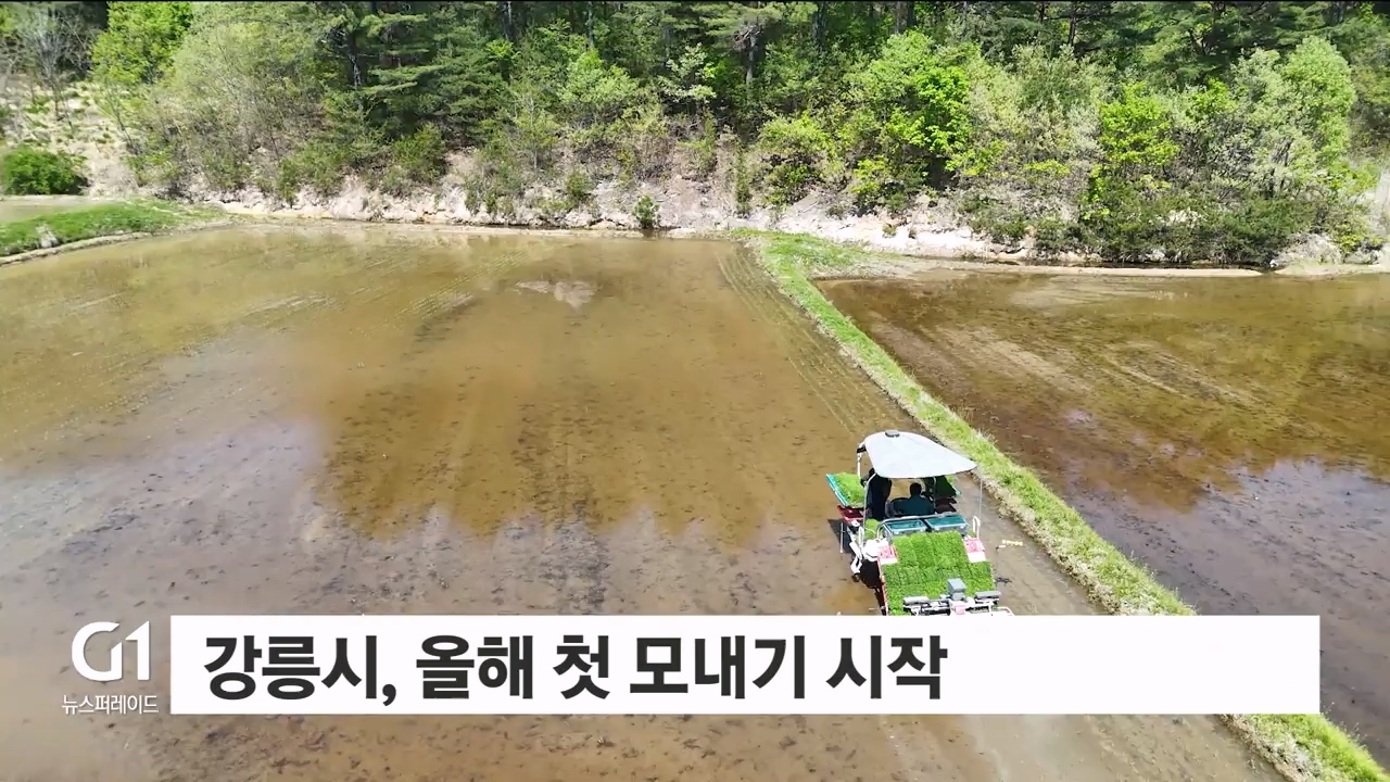 올해 첫 강릉지역 모내기가 강릉시 주문진읍 향호리 일대에서 시작됐습니다.