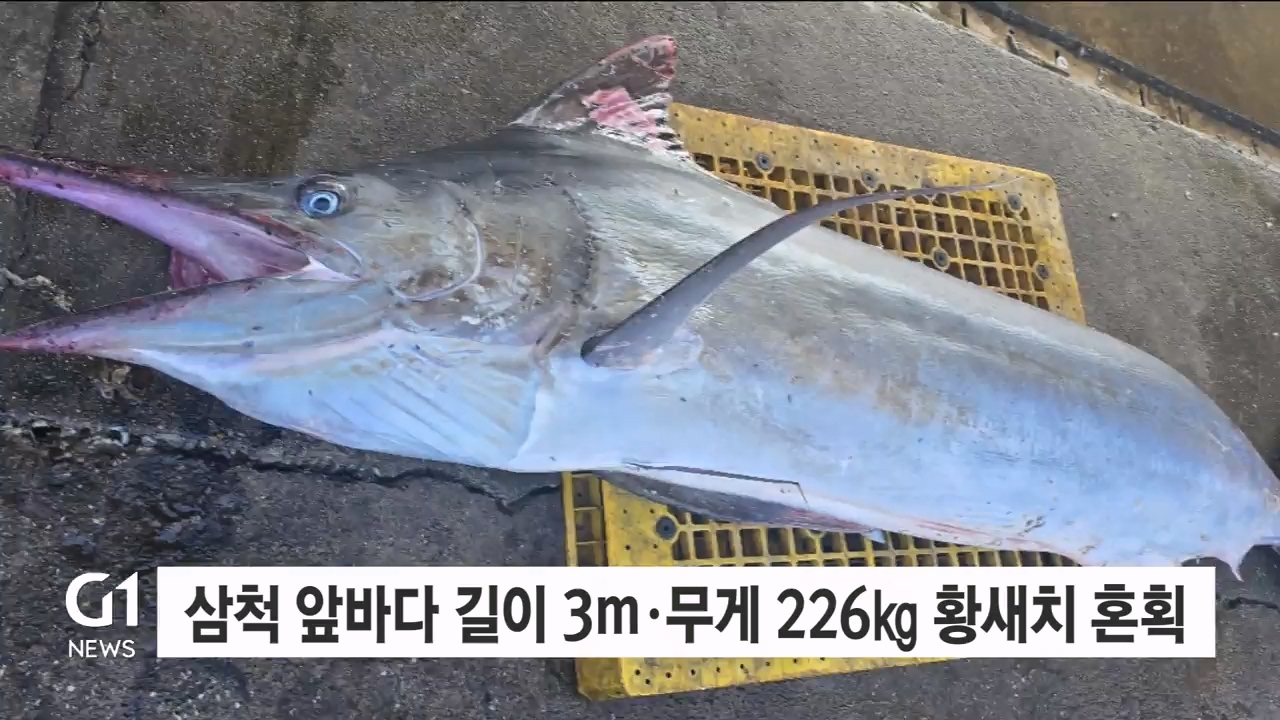 삼척시에 따르면 오늘 새벽 삼척 정라진 앞바다에서 길이 3m, 무게 226kg의 황새치가 정치망 어선에 잡힌 뒤 6만 원에 위판됐습니다.