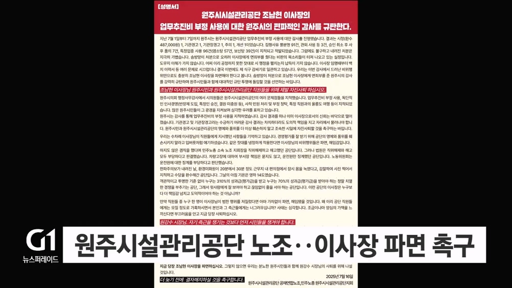 민주노총 원주시설관리공단지회와 원주시설관리공단 공채연합노조가 조남현 원주시설관리공단 이사장 파면을 촉구하는 성명서를 발표했습니다.