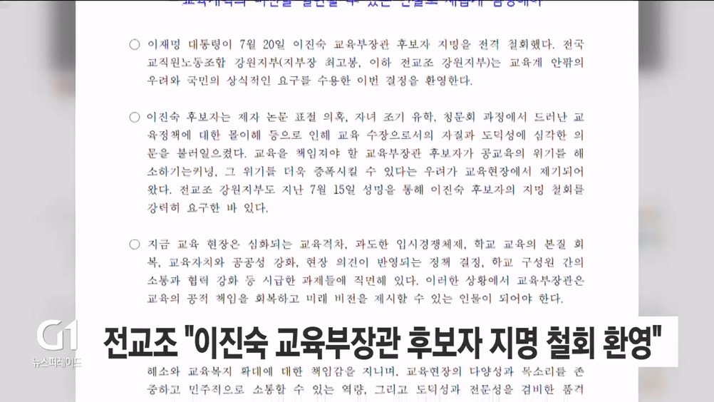 전국교직원노동조합 강원지부가 논평을 내고 "이재명 대통령의 이진숙 교육부장관 후보자 지명 철회를 환영한다"고 밝혔습니다.