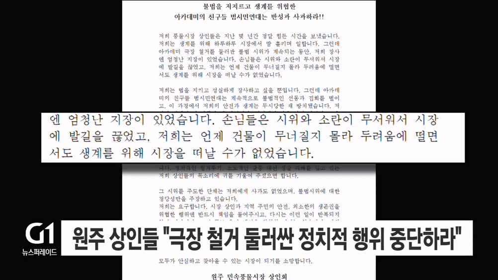 원주 민속풍물시장 상인회는 오늘(24일) 성명을 통해 "극장 철거를 둘러싼 반대 단체의 불법 점거 농성으로 상인들은 불안에 떨어야 했다"며 "선동과 집회로 인해 평범한 일상을 빼앗기고 있다"고 지적했습니다.